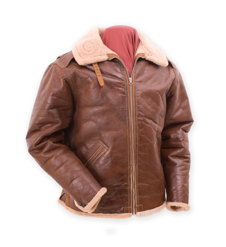The Army Air Corps standardized the B-6 Flight Jacket in 1939, specifically intending it to fill the gap between the lighter A-2 and the heavy B-3 Flight Jackets. Originally produced in very small numbers from the very costly hand-dyed, vegetable-tanned “redskin” hides of the 1939-41 years, by late 1941 the B-6 Flight Jacket was being made from the same less costly chrome-tanned, spray-dyed dark brown sheepskin with that buttery wool color found on the revised, post-1941 B-3 Flight Jacket, only in 1/4-inch depth wool, half that of the B-3 Flight Jacket. The B-6 Flight Jacket was favored by bomber crewmen operating in the less-exposed positions, as well as fighter pilots, who preferred a less-bulky jacket in their cramped cockpits, such as in the poorly heated P-38 Lightning. The B-6 Flight Jacket is a uniquely styled flight jacket, made all the more unique due to the very low production of this item from 1939-43; extant original examples of the post-1941 B-6 Flight Jacket in nice condition are extremely scarce and valuable today, and extant original pre-1942 B-6 Flight Jackets in any condition are virtually unobtainable.